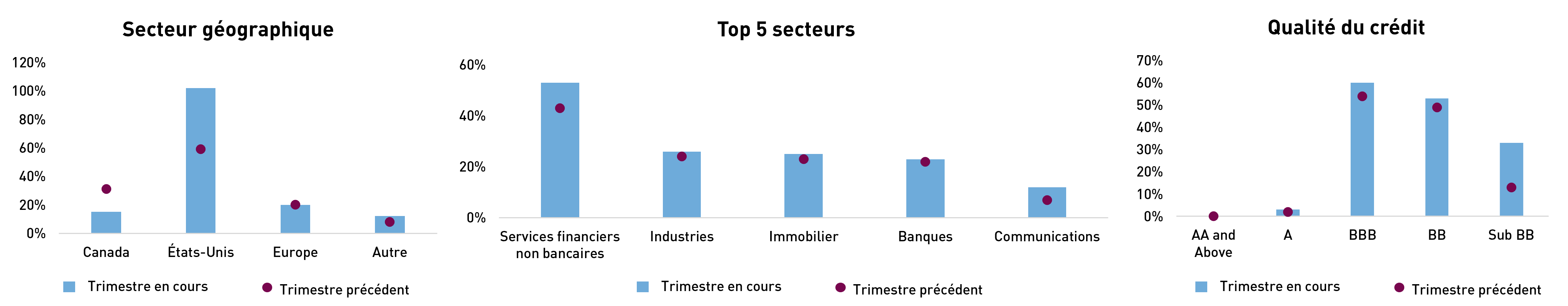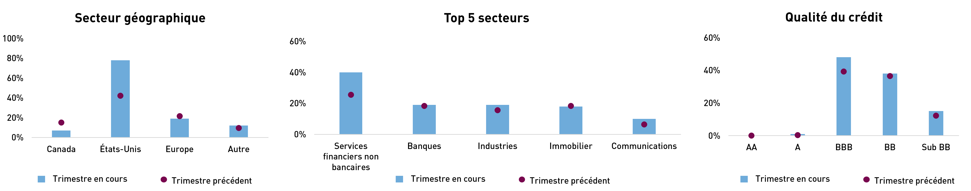 Dans l’ensemble, le portefeuille demeure positionné de façon prudente tout en offrant un rendement net attrayant de 6,9 %. Nous estimons que ce positionnement plus conservateur place le portefeuille en bonne position pour tirer parti d’opportunités attrayantes à mesure qu’elles se présentent. Entre-temps, nous visons à continuer d’offrir aux investisseurs une solution de rechange efficace aux allocations traditionnelles en revenu fixe, en actions et en actifs privés.
