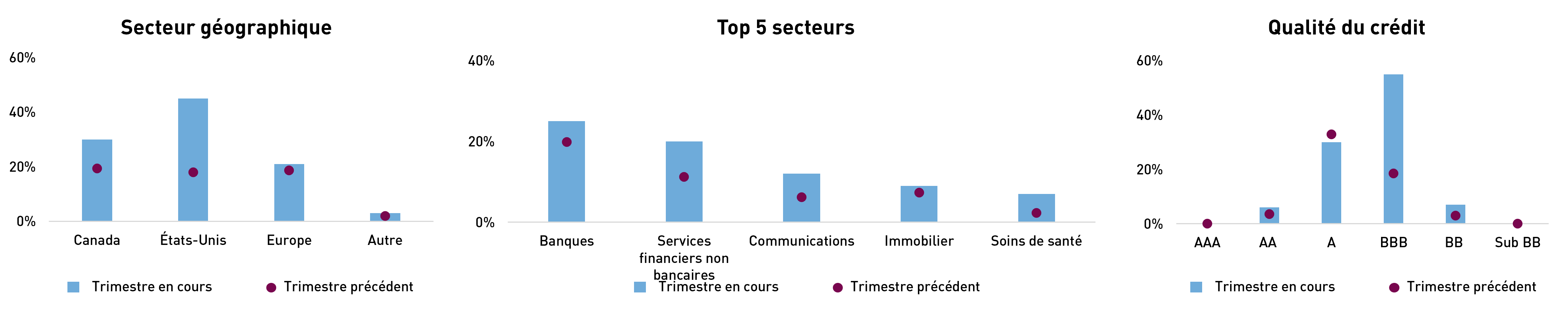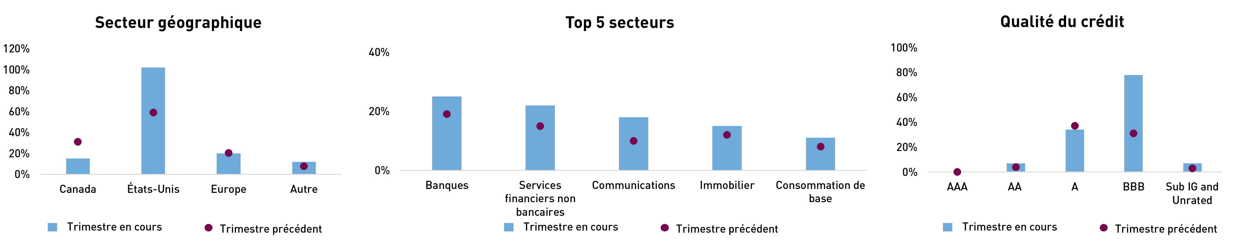 Le portefeuille continue de privilégier l’exposition aux taux à court terme — particulièrement la durée canadienne — tout en tirant son exposition au crédit principalement de titres libellés en USD à forte conviction et de crédit canadien IG à courte échéance, où les écarts sont devenus plus attrayants. Le positionnement est concentré dans des financières de grande qualité et des émetteurs TMT à forte conviction, ainsi que dans des positions vendeuses ciblées sur certains émetteurs dans des secteurs cycliques plus vulnérables. La qualité globale du portefeuille demeure élevée, avec une exposition limitée au HY, largement concentrée dans des titres hybrides émis par des émetteurs notés IG au niveau senior.