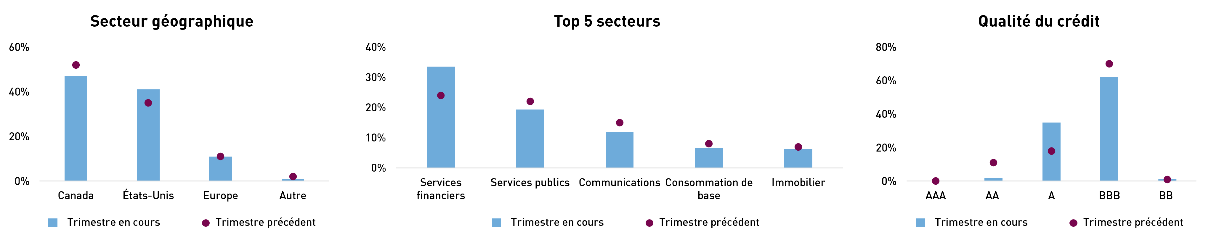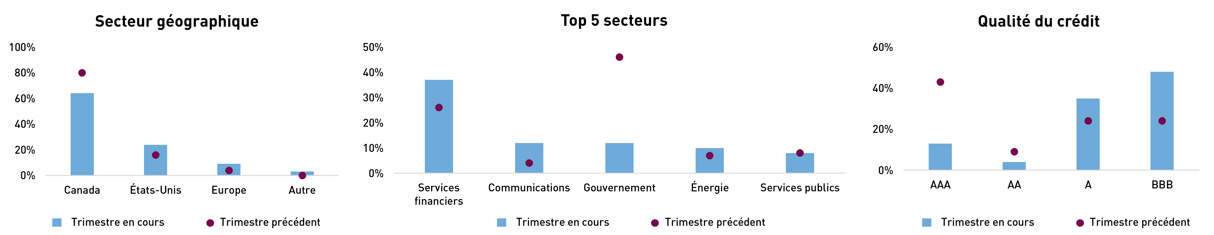 Du côté du crédit, l’exposition est demeurée relativement modérée en début de période, avant d’augmenter à la suite de l’élargissement des écarts. Le portefeuille a réduit son exposition aux titres liés aux gouvernements au profit d’ajouts sélectifs en crédit de grande qualité, particulièrement parmi les émetteurs financiers de haute qualité libellés en CAD et en USD, où les valorisations sont devenues plus attrayantes. La qualité globale du portefeuille demeure élevée, puisque nous continuons de privilégier le crédit IG et estimons que les valorisations actuelles ne compensent pas adéquatement pour un positionnement plus bas dans le spectre du crédit.