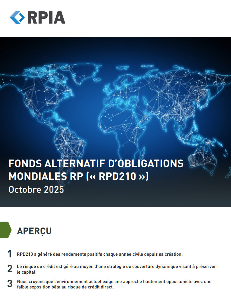 Le Fonds alternatif d’obligations mondiales RP cherche à générer des rendements ajustés au risque attrayants en mettant l'accent sur la préservation du capital. Le fonds investit principalement dans des titres de créance de première qualité et des titres assimilés à des titres de créance de première qualité émis par des sociétés et des institutions financières.