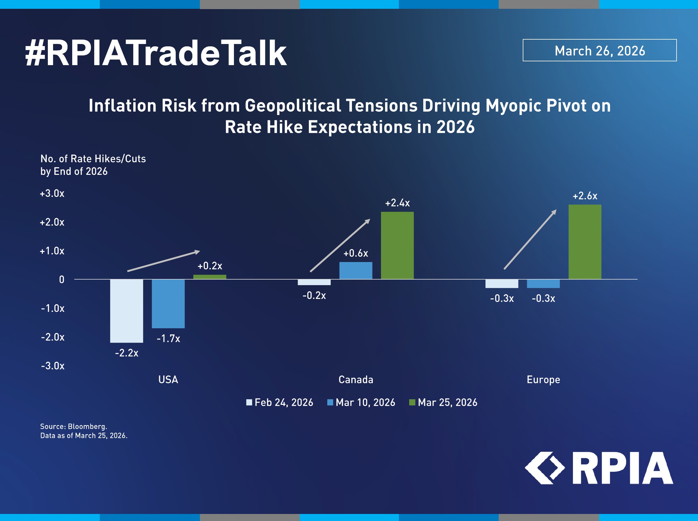 Inflation risk has been the dominant theme over the past two weeks, with market sentiment increasingly shaped by rising geopolitical tensions and a growing realization that the current energy shock may prove more persistent than initially expected. As a result, policymakers are focusing more on anchoring inflation expectations, even as the growth outlook becomes more fragile. Just one month ago, US, Canadian, and European markets were pricing varying degrees of rate cuts; however, those expectations have shifted sharply, with energy-importing regions like Europe now pricing in as many as 2.6x rate hikes vs. a -0.3x cut only two weeks ago.