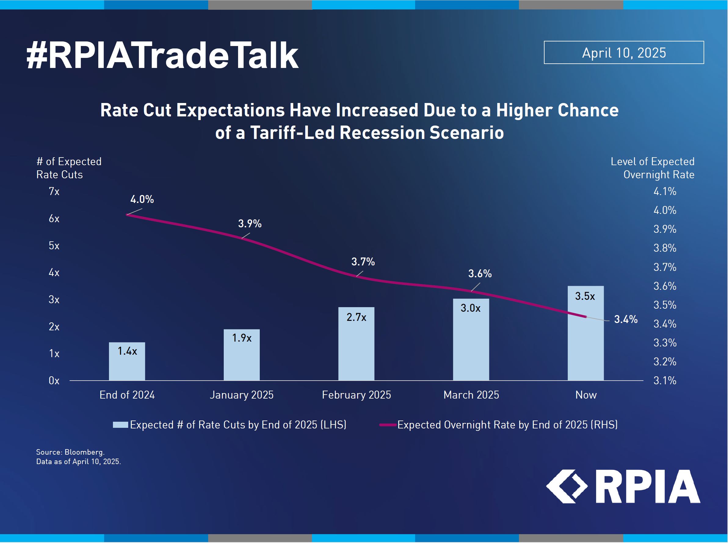 The U.S. market has priced in a more aggressive path of rate cuts following the larger-than-expected tariffs and potentially higher-than-expected probability of recession from them. As of now, 3.5x 25-basis-point cuts are expected by December 2025, which implies a terminal rate of 3.4% and is a sharp increase from just 1.4 cuts priced in at the start of the year.